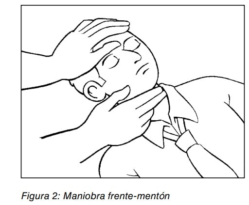 Un adulto suele respirar de 16 a 20 veces por minuto. Una respiración implica un movimiento de inspiración (entrada de aire) y otro de espiración (salida de aire). Realizaremos una apertura de la vía aérea a través de la maniobra frente – mentón basculando suavemente la cabeza hacia atrás con la palma de una mano sobre la frente y levantando el mentón con la punta de los dedos de la otra mano. (Ver fig.2).