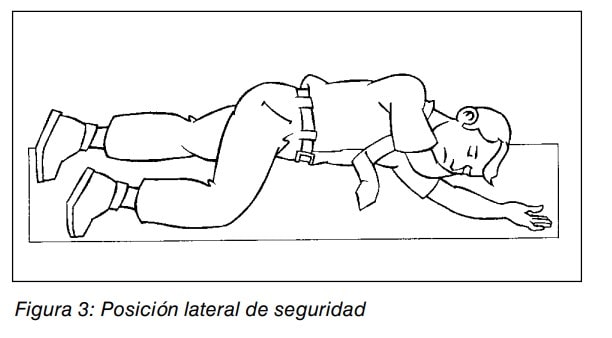 Si respira colocaremos al paciente en Posición Lateral de Seguridad (PLS). (Ver fig.3). Si no respira, pasaremos a realizar una Reanimación Cardiopulmonar (RCP).