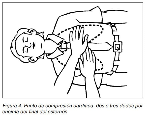 - La RCP debe efectuarse sobre una superficie dura y con la víctima boca arriba. Deberemos colocar el talón de una mano en el centro del pecho con el talón de la otra mano por encima, entrelazando los dedos de las manos y manteniendo los brazos rectos. Se ha de comprimir a una profundidad de aproximadamente 5 cm sin sobrepasar los 6 cm y nunca se debe perder el contacto entre las manos y el esternón. Antes de realizar una nueva compresión debemos permitir que el tórax se reexpanda por completo evitando permanecer apoyado sobre él. (Ver fig. 4)