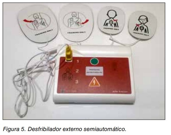 Los desfibriladores externos son dispositivos de fácil manejo con un mínimo de entrenamiento que permiten un análisis automático de la actividad eléctrica del corazón, la carga automática del aparato si el análisis es positivo y la administración de una descarga eléctrica de intensidad apropiada de forma automática (DEA) o por la persona que auxilia a la víctima (DESA). Incorporan mensajes que instruyen en todo momento a la persona que los utiliza sobre lo que debe hace, si debe proceder a administrar la descarga (DESA) o si ha de continuar con las maniobras de RCP. Su utilidad es incuestionable ante una Fibrilación Ventricular (FV), primera causa de parada cardiorrespiratoria, y que se define como una actividad caótica del corazón sin latido eficaz. El uso del DEA o DESA reestablece el latido normal del corazón a través de un choque eléctrico siendo el único tratamiento efectivo en caso de FV. Las posibilidades de obtener una reanimación exitosa se reducen un 10% por cada minuto que tardemos en desfibrilar. (Ver fig. 5 y 6).