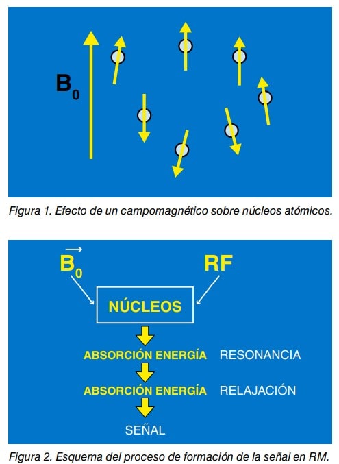 En IRM se somete lo que se quiere analizar a B0 y después se aplica una radiofrecuencia. Cuando coincide la frecuencia de esta RF aplicada con la frecuencia de vibración de los protones, éstos absorben energía y entran en resonancia (he aquí la procedencia del término resonancia magnética). Posteriormente, al relajarse, liberan la energía en forma de ondas de RF, permitiendo así la formación de una señal. La figura 2 es un resumen esquemático de este proceso.