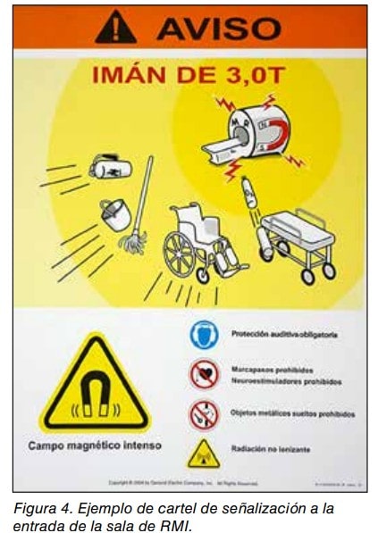 - Señalización La señalización de seguridad es una medida preventiva complementaria. En el caso de las salas de IRM debe prevenir de la exposición al campo magnético, tanto de los trabajadores como de objetos que puedan verse atraídos por el imán. Es preciso que haya señalización en las zonas colindantes, no solamente en la puerta de acceso a la sala del imán. En la entrada a la sala del imán debe estar señalizada la prohibición de introducir objetos que puedan ser atraídos por el campo magnético, con un cartel como el que se muestra en la figura 4. Para que la señalización sea eficaz debe llamar la atención. Por eso, además de los carteles en la puerta y zonas adyacentes, en algunas instalaciones se colocan carteles plastificados en el suelo, ya que, al ser una ubicación inusual para la señalización, llama más la atención. En muchas máquinas hay dibujada una línea que delimita la zona en la que el campo es superior a 5 gauss, por lo que la ubicación en esa zona interior de equipos compatibles, aunque no sean ferromagnéticos, puede alterar el correcto funcionamiento de los equipos (respiradores, monitorizadores, bombas de infusión, etc.) y producir artefactos en la imagen. Para los trabajadores es más seguro permanecer fuera de esa línea, y lo apropiado es realizar ahí toda maniobra de tipo sanitario o técnico que no pueda hacerse en el exterior de la sala.