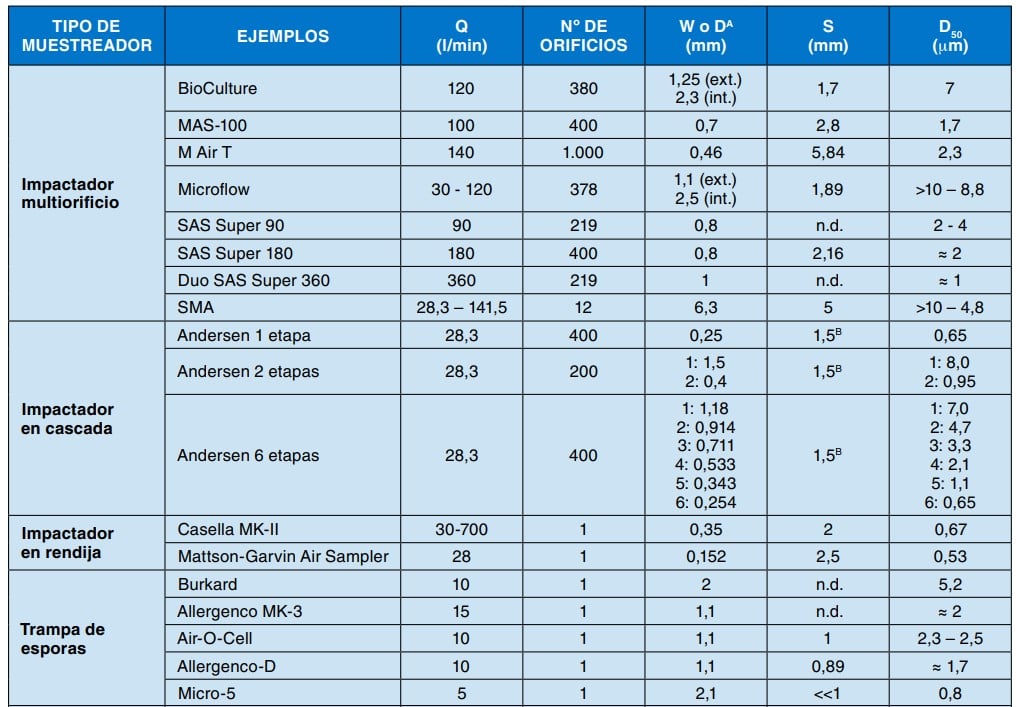 Existen diversos tipos de impactadores multiorificio, describiéndose a continuación las características de algunos de los más utilizados, así como la eficiencia de captación que muestran según estudios realizados: BioCulture, Microbiological Air Sampler (MAS-100), Microflow, Millipore Air Tester (M Air T), Sterilizable Microbial Atrium (SMA) o Surface Air System (SAS).