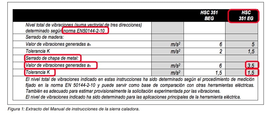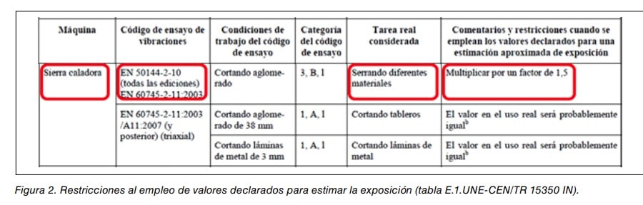 Conforme lo establecido en la tabla E.1, relativa a máquinas eléctricas, del informe UNE-CEN/TR 15350 IN, para las sierras caladoras cuya vibración generada se haya determinado aplicando la norma UNE-EN 50144-2-10, se debe “Multiplicar por un factor de 1,5” (ver figura 2), por lo que hay que aplicar el factor de corrección por el tipo de máquina y el código de ensayo de vibraciones empleado.