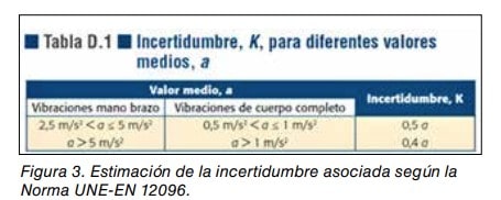 En el caso de que el fabricante NO proporcione la incertidumbre (k), la Norma UNE-EN 12096 facilita una tabla que puede ayudar a estimar la incertidumbre asociada a la aceleración medida por el fabricante (ver figura 3).