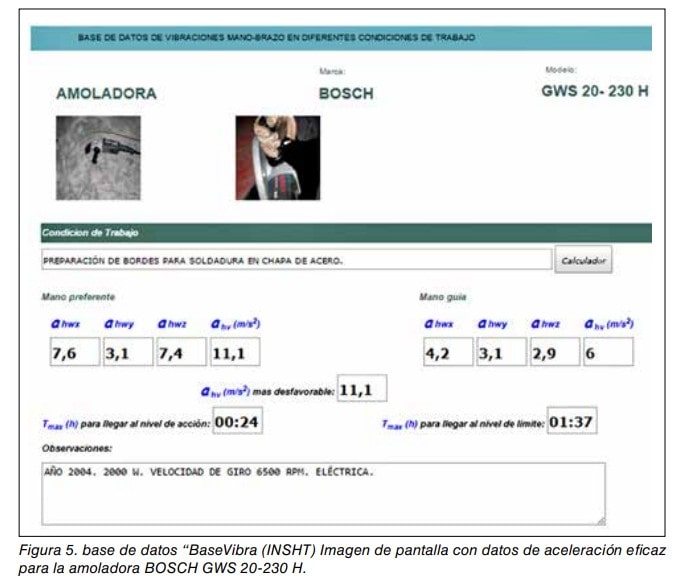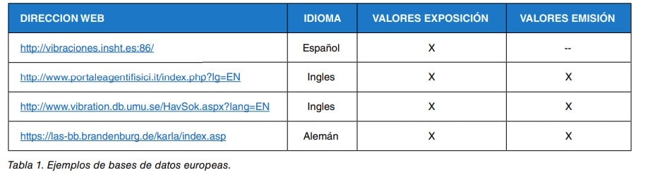 Entre las bases de datos europeas, la base de datos elaborada por el INSHT “BaseVibra”, es la única que actualmente está disponible en castellano. Es una base de datos de valores reales de exposición a vibraciones mecánicas elaborada con datos provenientes no solo de ensayos propios del INSHT, sino también con datos de mediciones aportadas por CCAA y empresas privadas.
