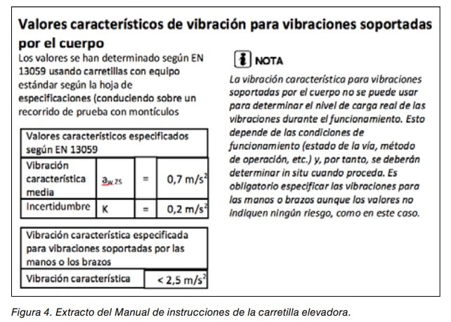 En la figura 4, se observa que sólo incluye el valor de la aceleración de emisión correspondiente al eje Z. Ello es debido a que en las vibraciones de cuerpo entero la aceleración se determina seleccionando la mayor aceleración de emisión entre las correspondientes a los tres ejes. En carretillas elevadoras es habitual que el eje dominante sea el eje Z, y en este caso la aceleración ae es 0,7 m/s2, y la incertidumbre K es 0,2; de donde: