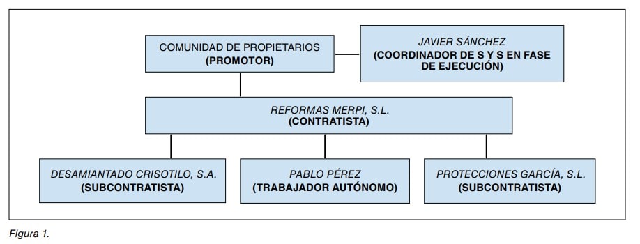 Observación preliminar: Para facilitar la lectura de este supuesto, en la figura 1 se representan las empresas ficticias que se han utilizado en el ejemplo, indicando la figura que les corresponde conforme al RD 1627/1997: