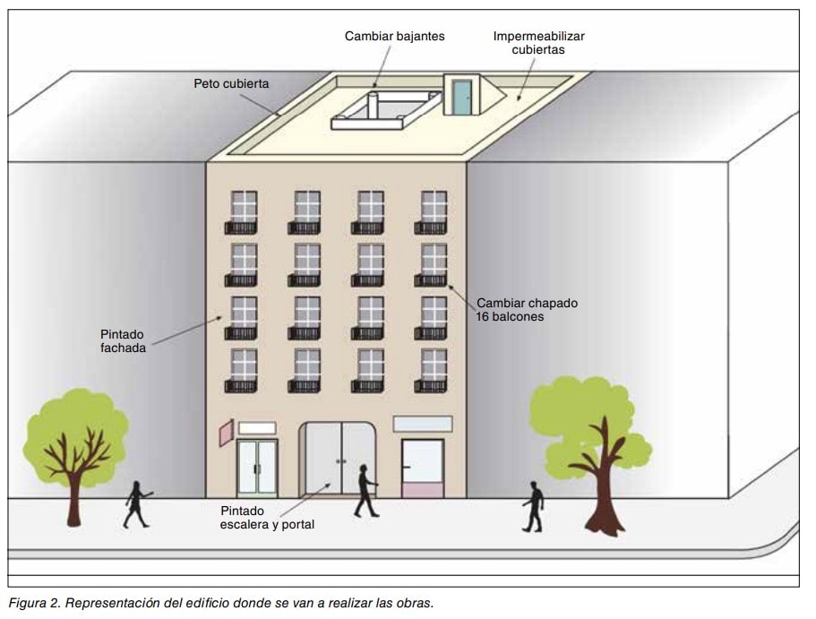 En una comunidad de propietarios ubicada en Madrid se debe realizar una obra a consecuencia de las deficiencias observadas tras la Inspección Técnica del Edificio (ITE), que ha resultado desfavorable. Los trabajos a ejecutar consisten en la reposición del chapado de los balcones, la impermeabilización de la cubierta y el cambio de las bajantes que discurren por el interior de las viviendas. Aprovechando estos trabajos, la comunidad ha decidido proceder a la rehabilitación y limpieza de la fachada y al pintado de las escaleras y el portal.