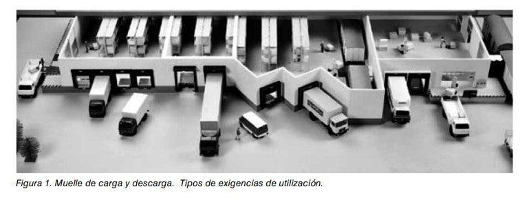• Vehículos de transporte y mercancías. Las medidas, la diversidad y el tipo de la mercancía tienen un papel importante a la hora de elegir el equipamiento. Se deben definir el número de estaciones de carga y descarga necesarias en función del número de vehículos que llegan al mismo tiempo, así como la duración de los procesos de carga y descarga, para determinar el espacio de maniobra necesario.