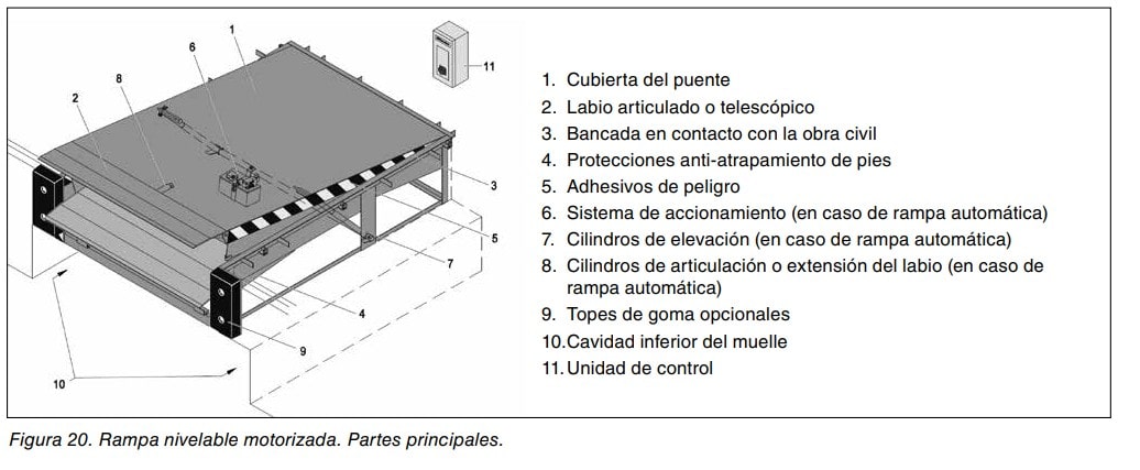 • Rampa nivelable: Dispositivo fijo o móvil destinado a cubrir el espacio entre un muelle de carga o zonas similares de carga y la superficie de carga de un vehículo que pueden estar a diferentes niveles. Habitualmente está formada por una plataforma abisagrada en su extremo posterior, que se eleva mediante un sistema mecánico (normalmente hidráulico) hasta la altura de la caja del camión. En el extremo anterior dispone de un labio articulado o telescópico que se apoya sobre el suelo de la caja del vehículo.