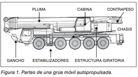 - Grúa móvil autopropulsada: aparato de elevación de funcionamiento discontinuo, destinado a elevar y distribuir en el espacio cargas suspendidas de un gancho o cualquier otro accesorio de aprehensión, dotado de medios de propulsión y conducción propios o que formen parte de un conjunto con dichos medios que posibilitan su desplazamiento por vías públicas o terrenos.