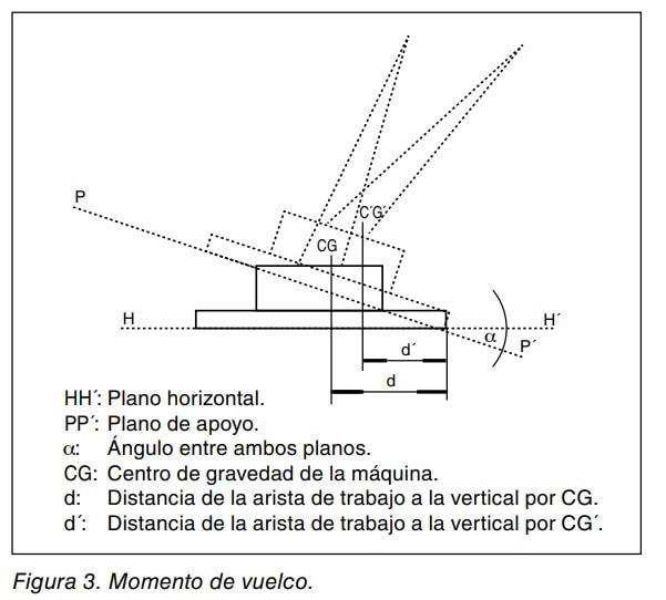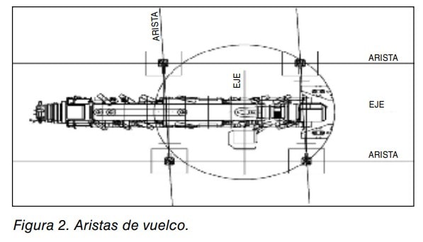 Se admite que una grúa es segura contra el riesgo de vuelco cuando, trabajando en la arista de vuelco más desfavorable (línea que forman dos apoyos o estabilizadores consecutivos) no vuelca: