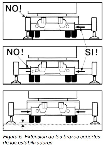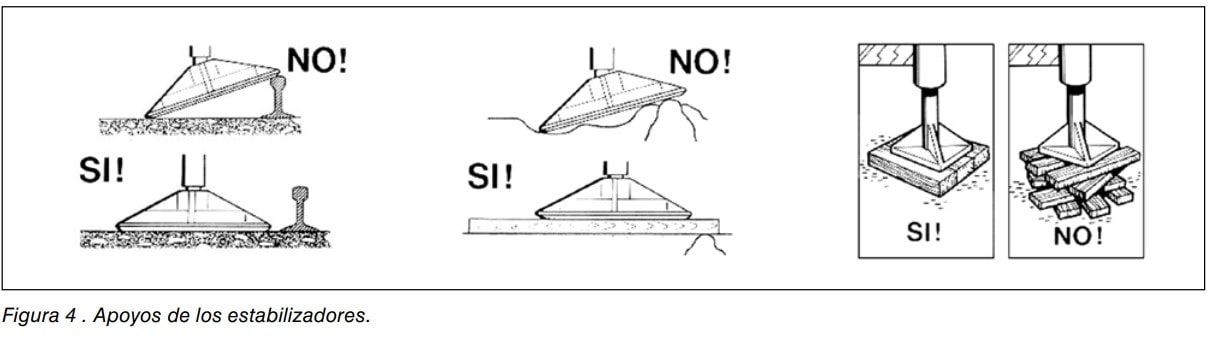 - Situar los pies entre el gato hidráulico de alguno de los estabilizadores y el suelo en la operación de bajada del mismo.