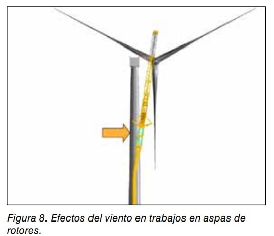 Cuando se levantan cargas con grandes superficies expuestas al viento, como por ejemplo: aspas de rotores o rotores completos de centrales de energía eólica, es posible que se puedan superar los valores estándar especificados en la norma UNE-EN 13000 y que son la base para el cálculo de la grúa. Ver figura 8.
