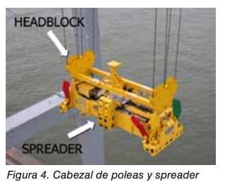 La grúa dispone de un accesorio de elevación denominado cabezal de poleas (headblock) el cual está sujeto por una parte, a través de un sistema de reenvío de cables de acero al mecanismo de elevación de la máquina, y que por la parte inferior se engancha al spreader por medio de twistlocks o cerrojos giratorios (también denominados bulones, tacillas, pletinas, etc.).