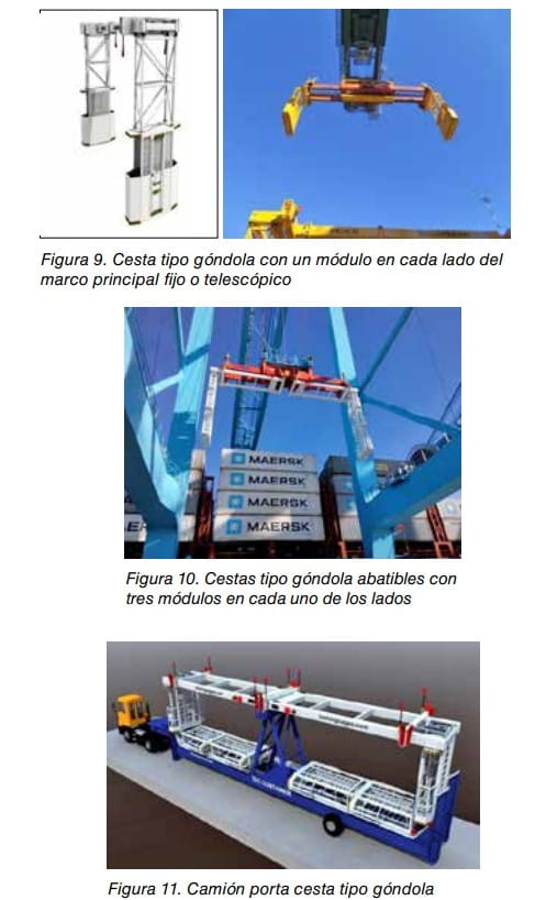 Son aquellas que se posicionan entre las filas de contenedores y el trincaje y destrincaje se realiza de forma manual o con herramientas específicas que actúan sobre las tacillas o twistlocks. Tienen la particularidad, en algunos casos, de poder adaptar la distancia entre ambos grupos de cestas para poder introducirse entre las filas de contenedores de longitud variable de 20´ a 45´. Pueden tener uno, dos o tres módulos o tener un módulo en uno o a ambos lados del marco principal que es cogido por el spreader de la grúa. Ver figuras 9 y 10. Las cestas de tres módulos son transportadas sobre una estructura diseñada específicamente para ello. Ver figura 11.