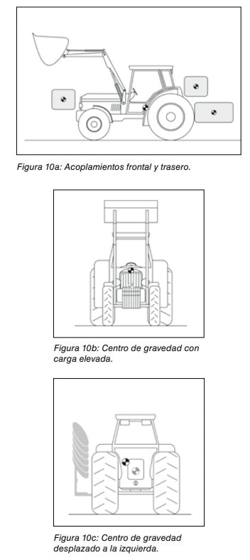 Cuando se acoplan al tractor equipos intercambiables suspendidos, tanto en las partes frontal y trasera como en los laterales, el centro de gravedad del conjunto tractorequipo puede llegar a situarse más próximo a los límites de la zona de estabilidad, aumentando el riesgo de vuelco (figuras 10a, 10b y 10c). Su nueva ubicación dependerá del peso del equipo intercambiable y de la posición de su centro de gravedad. Por tanto, la utilización de equipos suspendidos está limitada a aquellos equipos que por su peso y dimensiones no generen el vuelco del tractor.