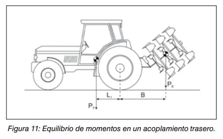 En el caso de acoplamiento trasero, el tractor es más inestable cuando el peso del equipo o la distancia entre su centro de gravedad y el eje trasero del tractor son mayores, siendo capaces de generar un momento de vuelco superior al momento de recuperación debido al peso del tractor (figura 11).
