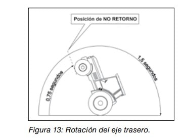 Cuando los neumáticos traseros quedan bloqueados en el terreno, el eje trasero no puede girar y el chasis del tractor rotará alrededor de dicho eje. Esta rotación inversa provoca que la parte delantera del tractor se levante del suelo y que el centro de gravedad llegue a traspasar la línea de estabilidad trasera. Una vez alcanzada esta posición de no retorno, el tractor continuará rotando hacia atrás por su propio peso hasta que choca contra el suelo (figura 13). El vuelco hacia atrás ocurre tan rápidamente que el conductor apenas tiene tiempo para reaccionar. Se estima que la posición de no retorno se alcanza en 0,75 segundos y que el vuelco tiene lugar en 1,5 segundos.