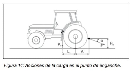 Simultáneamente, la carga acoplada al tractor está tirando hacia atrás y hacia abajo oponiéndose al movimiento de avance del tractor. Por tanto, la carga remolcada actúa como una fuerza que trata de volcar el tractor hacia atrás (figura 14).