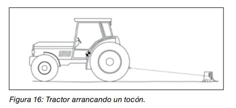 Supongamos que se quiere extraer un tocón utilizando un tractor (figura 16). Para ello se amarra una cadena alrededor del tocón y se acopla al punto de enganche del tractor. Si el tocón opone suficiente resistencia cuando el tractor comienza a tirar puede llegar a producirse un movimiento giratorio de las ruedas traseras por pérdida de adherencia. Esto continuará hasta que el conductor detenga el tractor. Pero puede darse el caso de que el movimiento giratorio de las ruedas traseras no sea suave y uniforme sino que resbalen de forma rápida y repentina y pudiendo incluso un neumático resbalar más que el otro. En estas condiciones puede desencadenarse la elevación de la parte delantera del tractor.