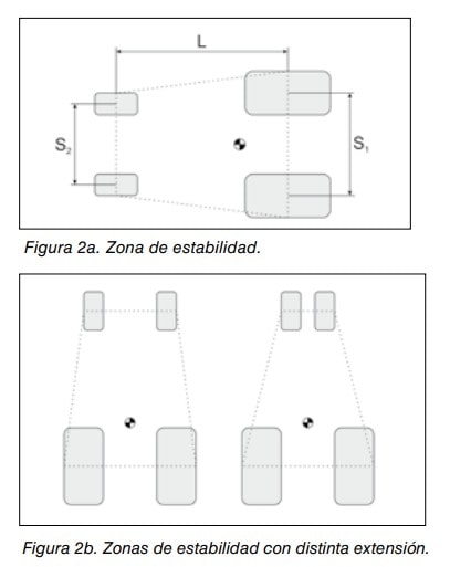 Cuando un tractor está apoyado en una superficie plana, las líneas imaginarias que unen los puntos de contacto de los neumáticos con la superficie del suelo delimitan la zona de estabilidad (base de apoyo) del tractor (figuras 2a y 2b). La línea que conecta los neumáticos traseros es la línea de estabilidad trasera, mientras que las líneas que conectan los neumáticos traseros y delanteros en el mismo lado son las líneas de estabilidad laterales.