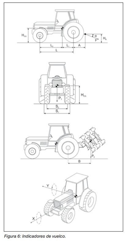 El análisis de los factores de inestabilidad puede realizarse mediante los indicadores de vuelco que son considerados como aquellas variables destinadas a evaluar la estabilidad del tractor (figura 6). Algunos de estos indicadores están relacionados con el diseño del tractor mientras otros dependen de los diferentes equipos que pueden llevar acoplados.