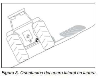 Cuando el tractor con equipos acoplados lateralmente circula por una pendiente, dichos equipos deben estar orientados hacia la parte superior de la pendiente y situados lo más próximo posible al suelo (figura 3).