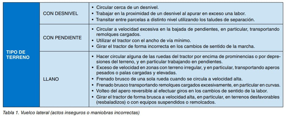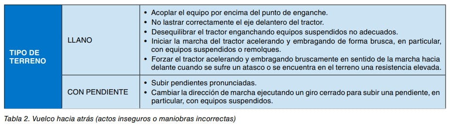 En muchos casos, la falta de adiestramiento del conductor junto con el desconocimiento de los límites del tractor y de los graves riesgos derivados de determinadas maniobras u operaciones, especialmente en terrenos difíciles o con pendientes, producen actos inseguros o maniobras incorrectas que provocan el vuelco (tablas 1 y 2).
