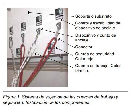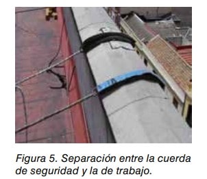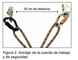 Una vez la cuerda de trabajo y la de seguridad se han anclado a la instalación de cabecera, debe mantenerse entre ellas una distancia, de 1 m a 1,5 m aproximadamente, con el objetivo de facilitar las tareas que realiza el trabajador vertical y de protegerla la cuerda de seguridad de las posibles agresiones que pueda sufrir como consecuencia de esos trabajos. Esto no es óbice para que la cuerda de trabajo también se proteja, a fin de garantizar una mayor seguridad en la ejecución de los trabajos verticales. Ver figura 5.
