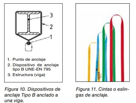 - Los dispositivos Tipo B: son aquellos que no requieren de un elemento de fijación o anclaje estructural para ser unido a la estructura. Se suelen caracterizar por su “provisionalidad”, es decir se instalan para realizar el trabajo y se retiran una vez finalizado este. Son considerados EPI. En estos casos la propia estructura del edificio (por ej. vigas metálicas) sirve para instalar el dispositivo de anclaje directamente (ver figura 10). Ejemplos típicos son las cintas o eslingas de anclaje. Ver figura 11.