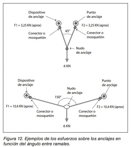 Cuando se utilizan varios puntos de anclaje se deben evitar los ángulos abiertos entre las eslingas o cuerdas que los unan, con el objeto de no sobrecargar los anclajes. Lo aconsejable es que los ángulos no superen los 60º, de forma que se reparta igualitariamente el esfuerzo entre los anclajes. En la figura 12 se pueden ver algunos ejemplos.