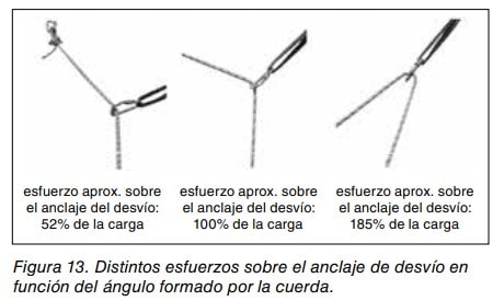 Es necesario dimensionar correctamente el anclaje sobre el que se va a realizar el desvío, ya que, dependiendo del ángulo formado por la cuerda, el mismo deberá soportar más o menos carga. Ver figura 13.