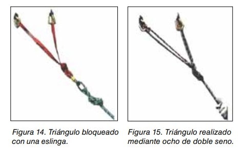 - Triángulo bloqueado con eslinga: Se puede aplicar siempre que los anclajes no estén muy separados y tenga una resistencia similar. Ver Figura 14.
