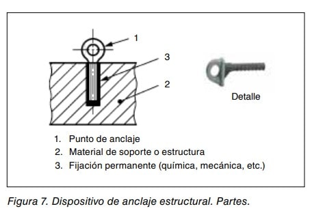 - Anclaje estructural: Elemento o elementos fijados permanentemente a una estructura que reúne todos los requisitos de seguridad, al cual o a los cuales es posible sujetar un dispositivo de anclaje o un equipo de protección individual • Anclaje mecánico: Tipo de dispositivo de anclaje que se fija al soporte por la presión que ejerce el mecanismo de expansión sobre las paredes del orificio taladrado sobre el soporte, substrato o superficie.