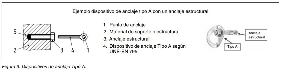 - Los dispositivos de Tipo A: necesitan de un elemento de fijación (puede quitarse de la estructura, por ejemplo un tornillo pasante) o un anclaje estructural (ver punto anterior). Ver figura 9.