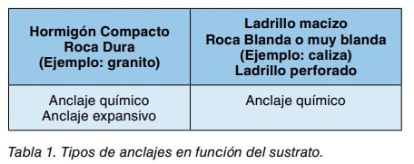 Para elegir el punto de anclaje más adecuado, resulta fundamental realizar un estudio sobre la resistencia del substrato sobre el cual se va a montar la instalación de cabecera. La resistencia a la extracción del anclaje, está íntimamente ligada a la resistencia a la compresión que tiene el propio substrato. En la tabla 1 se puede ver los tipos de anclaje más adecuados en función del tipo de sustrato.