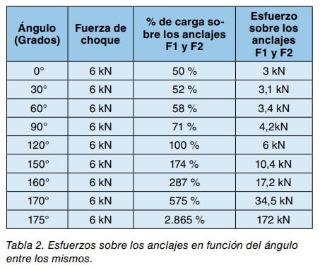 Si se unen dos anclajes mediante dos eslingas de anclaje se forma un “triángulo de fuerzas”, el esfuerzo soportado por cada uno, dependerá directamente del ángulo formado entre estas eslingas. En el supuesto de que un trabajador vertical sufra una caída en que se desarrolle una fuerza de choque de 6 kN (fuerza máxima de choque a la que puede verse sometido un trabajador en una caída utilizando correctamente un sistema anticaídas), hay que tener en cuenta que los esfuerzos sobre los anclajes se incrementan a medida que aumentan los ángulos entre los mismos. Ver tabla 2.