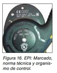 - Dispositivo de regulación de cuerda: una letra in dicando de qué tipo de dispositivo se trata (A, B, C, A/B, A/C o B/C); diámetros máximo y mínimo de las líneas de anclaje a utilizar; carga nominal Figura 16. EPI: Marcado, norma técnica y organismo de control.máxima; pictograma indicando el tipo de líneas de anclaje para las que el dispositivo es adecuado, (UNE-EN 1891: tipo A; otros tipos); indicación de la orientación correcta en uso normal.