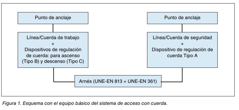 Como puede observarse en el esquema, el equipo básico está compuesto por una línea o cuerda de trabajo, línea o cuerda de seguridad con dos puntos de anclaje diferentes, un dispositivo de regulación de cuerda tipo A, un dispositivo de regulación de cuerda tipo B y C y un arnés. Para realizar las conexiones entre ellos será necesario utilizar otros equipos (conectores, equipos de amarre), así como para la realización del trabajo (silla o asiento de trabajo, cuerdas auxiliares, otros equipos de protección individual, etc.).