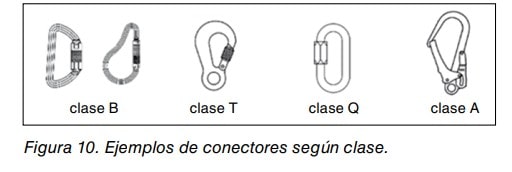Los conectores de cierre automático disponen de un mecanismo para el bloqueo del cierre que puede actuar automáticamente o mediante la acción manual del usuario. Para realizar una conexión segura es imprescindible que una vez cerrado el conector se proceda a su bloqueo. Para abrir los conectores de cierre automático el usuario debe efectuar dos acciones manuales deliberadas y diferentes, como mínimo. Los conectores de rosca están indicados para conexiones de larga duración. Ver figura 10.