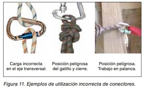 Salvo excepciones, un conector está diseñado para ser utilizado según el eje mayor, es decir para soportar la carga en el sentido longitudinal del eje principal con el gatillo cerrado y bloqueado. Es necesario destacar que el casquillo de bloqueo es el elemento menos resistente del conector, por lo que se tendrá este hecho en cuenta durante su uso. Ver figura 11.