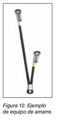 Es un componente o elemento de conexión flexible de un sistema de protección individual contra caídas con al menos dos terminales, con o sin dispositivo regulador de longitud. Tiene la consideración de EPI (ver NTP 774). Los equipos de amarre deben terminar bien de forma que se puedan conectar directamente a otro equipo o bien mediante un conector adecuado. La resistencia mínima exigida para un equipo de amarre textil es de 22 kN. Ver figura 12.