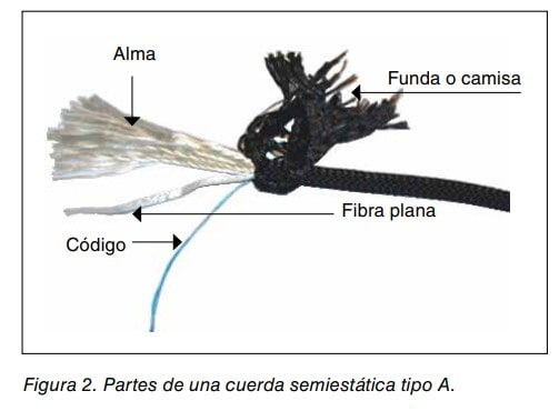 - Funda o camisa: Protege el alma de los agentes externos: abrasión, meteorológicos, químicos, etc., y es capaz de soportar entre el 1/3 y el 1/4 de la resistencia total de la cuerda.