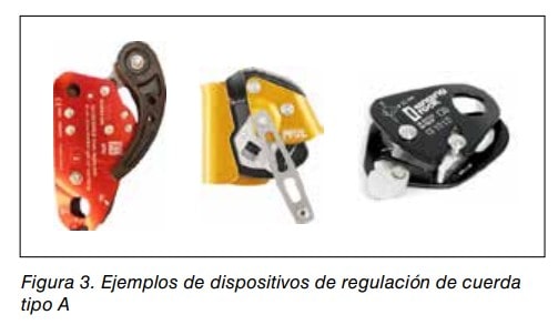 La norma que regula los dispositivos de regulación de cuerda es la UNE-EN 12841 Equipos de protección individual contra caídas. Sistemas de acceso mediante cuerda. Dispositivos de regulación de cuerda. Ver figura 3.