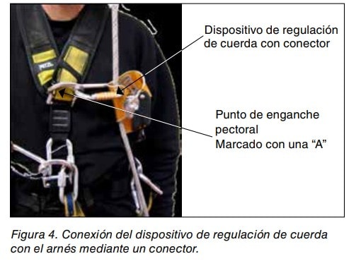 - Verificar la compatibilidad de los equipos utilizados (incluyendo la longitud) (arnés, conectores, equipos de amarre, etc.).Se debe tener en cuenta las indicaciones del fabricante sobre el tipo y especificaciones (incluyendo longitud) de los conectores y/o elementos de amarre a utilizar para enganchar el dispositivo de regulación de cuerda al arnés del usuario, así como la/s advertencia/s sobre cualquier limitación, por ejemplo, que el usuario no debe desviarse de estas especificaciones y longitudes”.