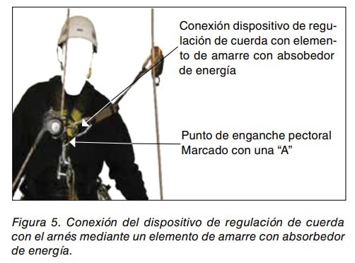 La utilización de un absorbedor de energía conectado al dispositivo de regulación de cuerda Tipo A dependerá de lo que establezca al respecto el fabricante del equipo. Ver figuras 4 y 5.