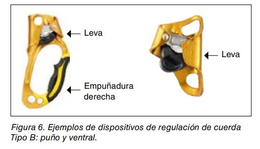 El dispositivo de regulación de cuerda Tipo B, también denominado dispositivo de ascenso, es un componente móvil para la cuerda de trabajo accionado manualmente, que se bloquea bajo la acción de una carga en un sentido y se desliza libremente en el sentido opuesto. Es un dispositivo para la progresión en ascenso que se caracteriza por su desplazamiento sobre la cuerda en un solo sentido, bloqueándose por la presión de una leva móvil sobre la cuerda si se ejerce una carga en el sentido contrario; en este caso sujeta la cuerda. Por lo tanto, permiten el deslizamiento controlado en un solo sentido siempre y cuando no se ejerza carga sobre ellos. En el caso de que el usuario suelte el dispositivo, éste se bloquea por sí mismo, evitando así una caída. Debe ser compatible con el tipo de cuerda y con el diámetro de la misma siguiendo las instrucciones del fabricante. Tiene la consideración de EPI. Ver figura 6.