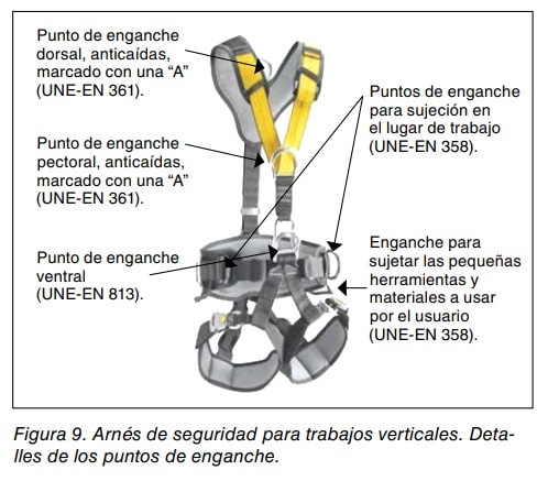 El arnés se conecta con la línea o cuerda de seguridad a través de los puntos de enganche anticaídas, y con la línea o cuerda de trabajo a través del punto de enganche ventral. El arnés puede complementarse con elementos de enganche de sujeción según la norma UNE-EN 358, que facilitan el desarrollo de los trabajos. Ver figura 9.